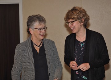Viering van 20 jaar De Stoep in de Zoete Inval. Onderonsje tussen Mary en de dochter van Elly.